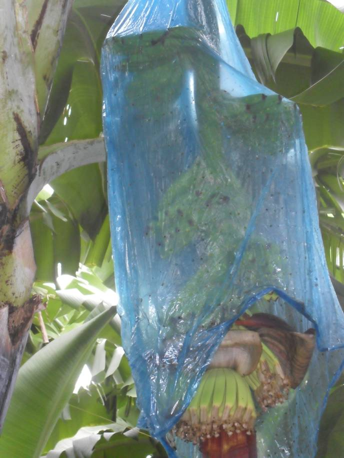 “La Bolsa que se utiliza contiene el ingrediente activo chlorpyrifos al 1%, su objetivo es repeler los insectos y mantener aislados otros agentes patógenos que atacan a temprana edad el desarrollo del racimo. La bolsa también crea un microclima estable que contribuye para el desarrollo del racimo desde su estado de bacota hasta la cosecha”.